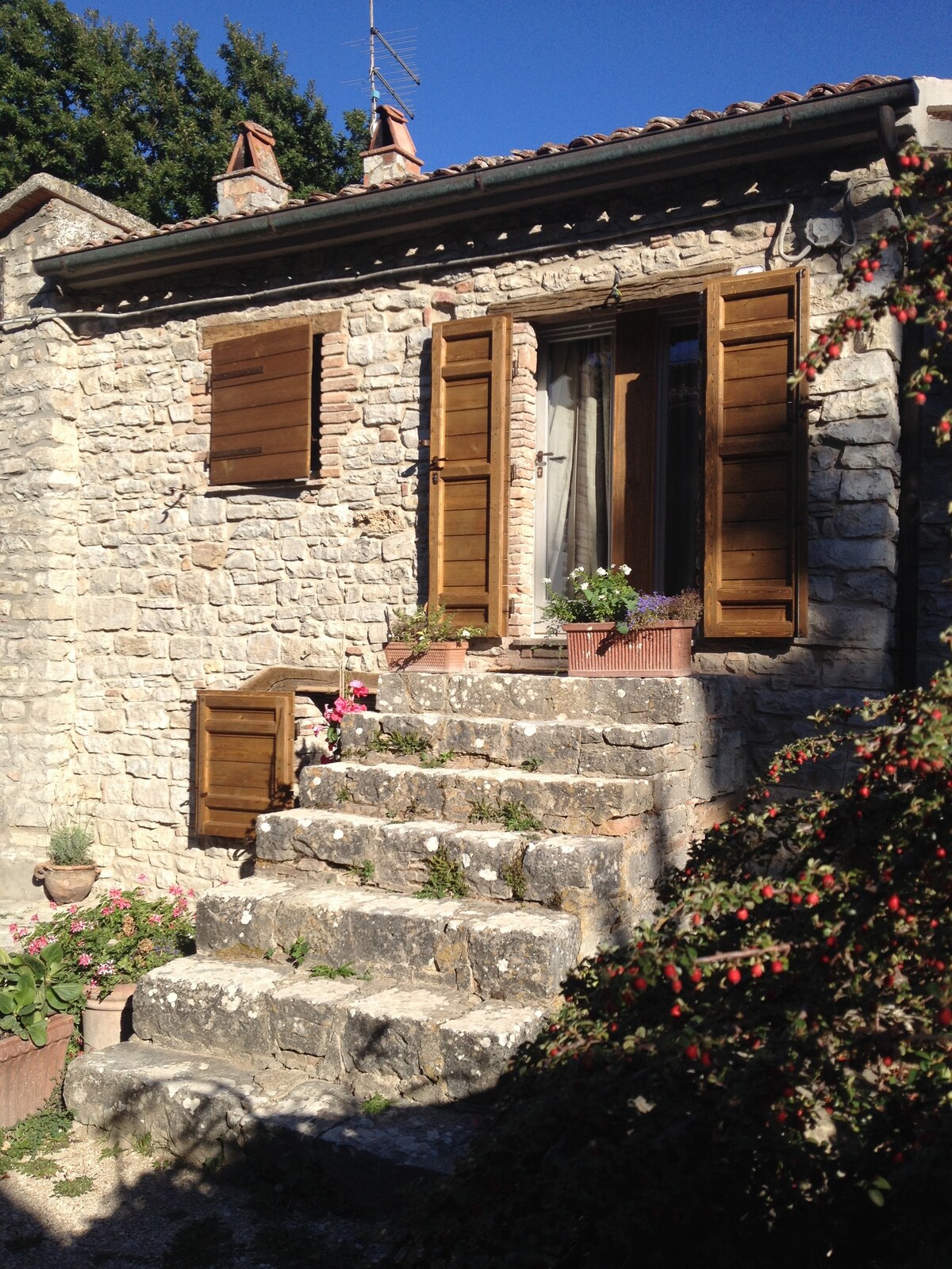 The house is surrounded by dense Mediterranean vegetation and a 1,000 m² garden. The house is equipped with 2 rooms mezzanine ( the ceilings are high about 5 meters ) and was restored preserving the characteristic local stone . Within a radius of about 25-30 km you will find: Citta' della Pieve, Orvieto, Cetona, San Casciano de' Bagni and many more ... In an hour by car you can reach cities such as Florence, Siena, Perugia, Assisi, in addition to Val D'Orcia and Val di Chiana.