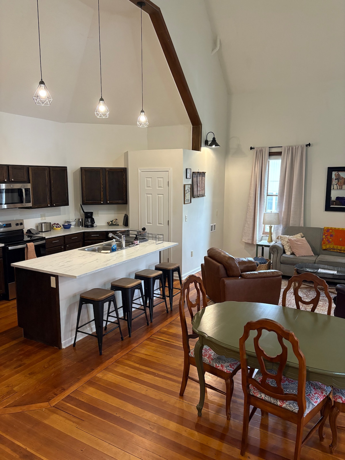 High Court Loft is on the 3rd floor above High Court Pub on Lanesboro 's historical Main Street. Veliki otvoreni prostor ima zidni krevet, kuhinju sa indukcionom šporetom sa 1 loncem, konvekcioni tosteroven, aparat za kafu, frižider i mikrotalasnu pećnicu. Potkrovlje je odlično za opuštanje ili zabavu u malim grupama. Veliki originalni prozori pružaju predivan pogled na živahni centar grada. Osim kreveta, tu je i luksuzni dušek na naduvavanje. Ljubimci nisu dozvoljeni.