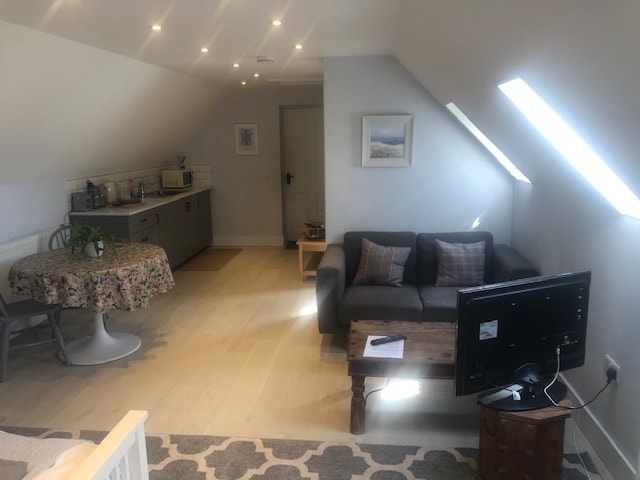 Prostrani jednosobni aneks sa sopstvenom kuhinjom i tuš kabinom. Do njega se dolazi kroz sopstvena vrata (pazite na glavu!), mali ulazni hodnik vodi u kuhinju, tuš kabinu i u veliku spavaću sobu okrenutu prema jugu s visokim plafonima i velikim prozorima s pogledom na prednji travnjak glavne kuće. Opustite se na udobnom kauču ili uživajte u obrocima za trpezarijskim stolom. Potpuno opremljen za kraće ili duže boravke. 20 minuta hoda preko polja do paba The Farmer's Dog.