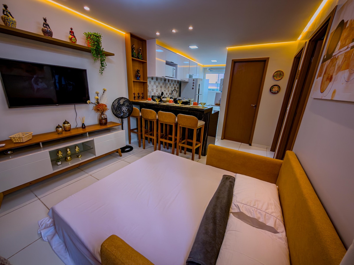 Root smeštaj sa 1 bračnim krevetom u spavaćoj sobi i u dnevnoj sobi, kauč na razvlačenje za 4 osobe. - 500 metara od tržnog centra Caruaru 🛍️ - 400 metara od Point do Caldinho 😏 - 300 metara od pekare 🥯 - 5 m vožnje do terase događaja Caruaru - 8 m vožnje do sajma Caruaru Craft 👒