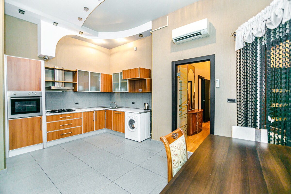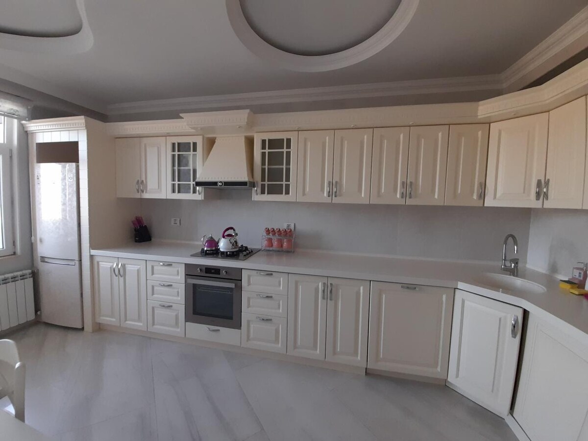 Ovaj stan površine 240 kvadratnih metara nudi luksuzan život u srcu grada. Sa tri spavaće sobe i jednim dnevnim boravkom, savršen je za porodice ili one koji uživaju u zabavi. Smješteni na odličnoj centralnoj lokaciji, bićete na samo nekoliko koraka od tržnog centra Port Baku, tržnog centra Crescent, hotela Absheron Marriott, restorana i prodavnica.