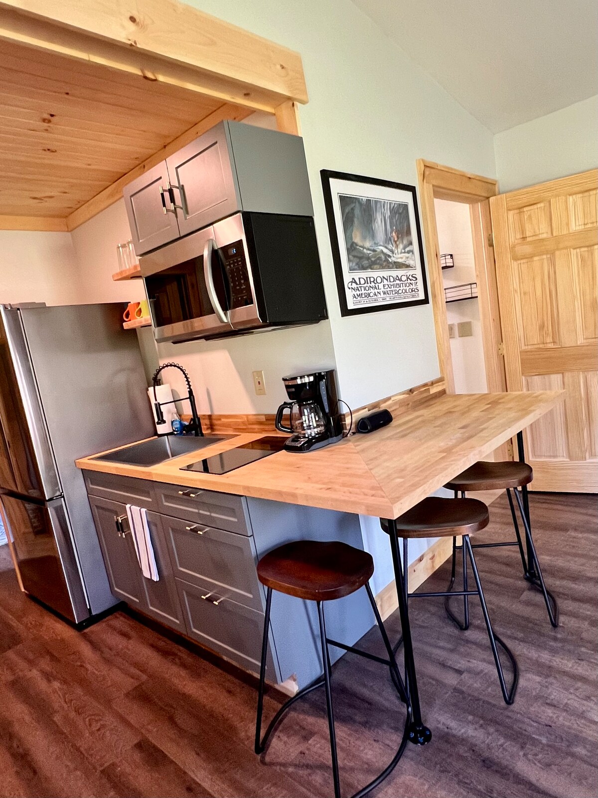 Moderan dizajn u jedinstvenom okruženju stvara poseban Adirondack doživljaj bez gužve. Nova konstrukcija na 3 nivoa sa prirodnim svetlom. Skrovita, ali puna svetlosti i dugih pogleda na planine, naslijepi voćnjak i šumu. Glavna spavaća soba sa kupatilom, radni prostor. Potpuno opremljena kuhinja i hidromasažna kada od kedra na terasi (dostupne tokom cele godine!) čine planinsku kuću veoma posebnim mestom. Odličan pristup svim zimskim aktivnostima na otvorenom.