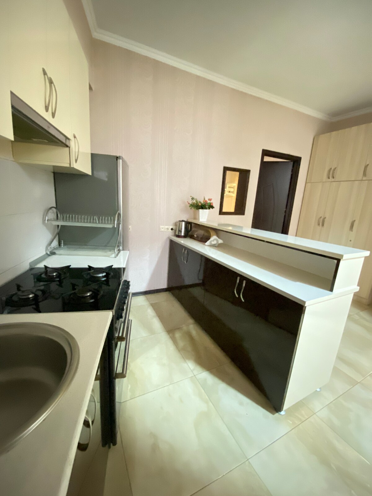 Nova, prostrana, udobna, najbolja lokacija u Batumiju, 100 metara od plaže, spavaće sobe s pogledom na planine, dnevni boravak s pogledom na more. Takođe, iz dnevne sobe se svake večeri mogu vidjeti laserske muzičke fontane. U blizini apartmana nalazi se Mekdonalds, 300 metara do delfinarijuma, 300 metara do centralnog parka Batumija, 50 metara do supermarketa (24 sata). Mnogi restorani sa različitim kuhinjama u okolini.