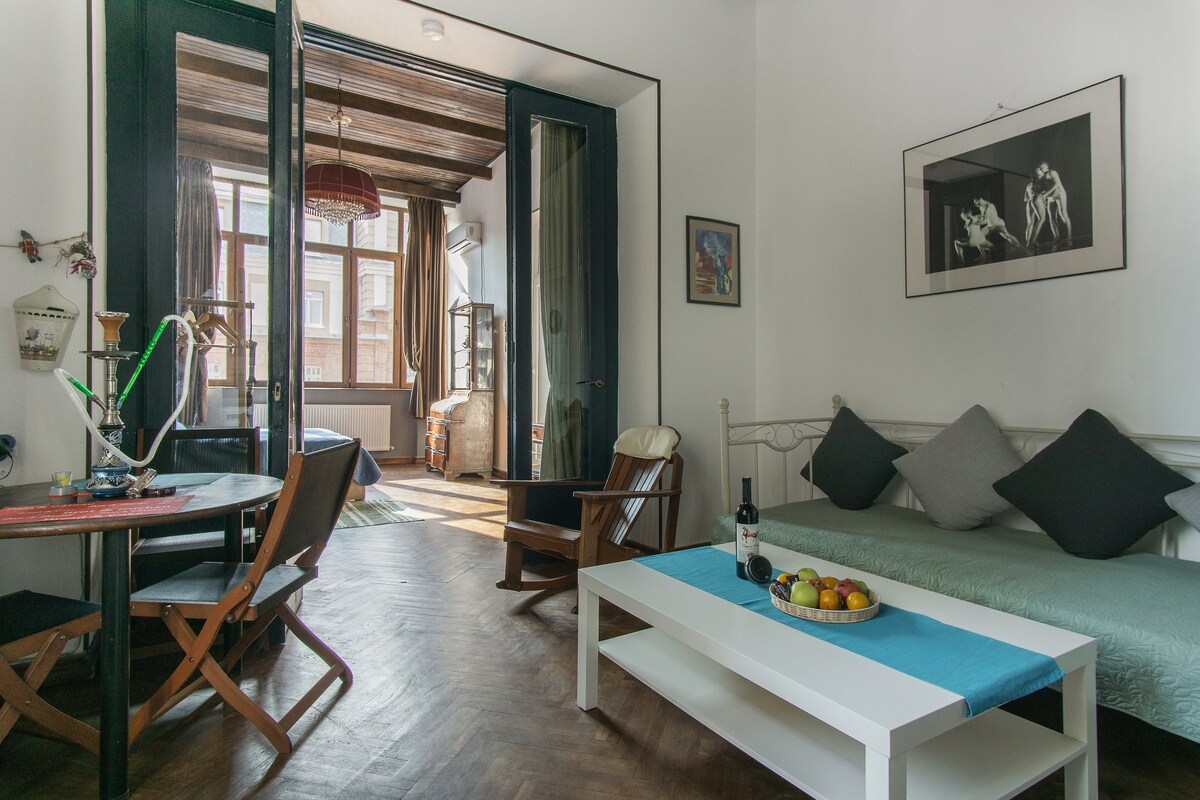 Enjoy your stay in the hottest spot of Tbilisi, surrounded with 5 star hotels: Biltmore, Radisson, Stamba and Rooms and just steps away from Rustaveli metro station and all the main attractions. You will be staying in the vintage loft, located on the top floor of a 1930s stone-built building, with a private terrace and beautiful views. Floor to ceiling windows provide plenty of sunshine, natural light and beautiful views from every room, but there are also heavy curtains for daytime dreamers:)