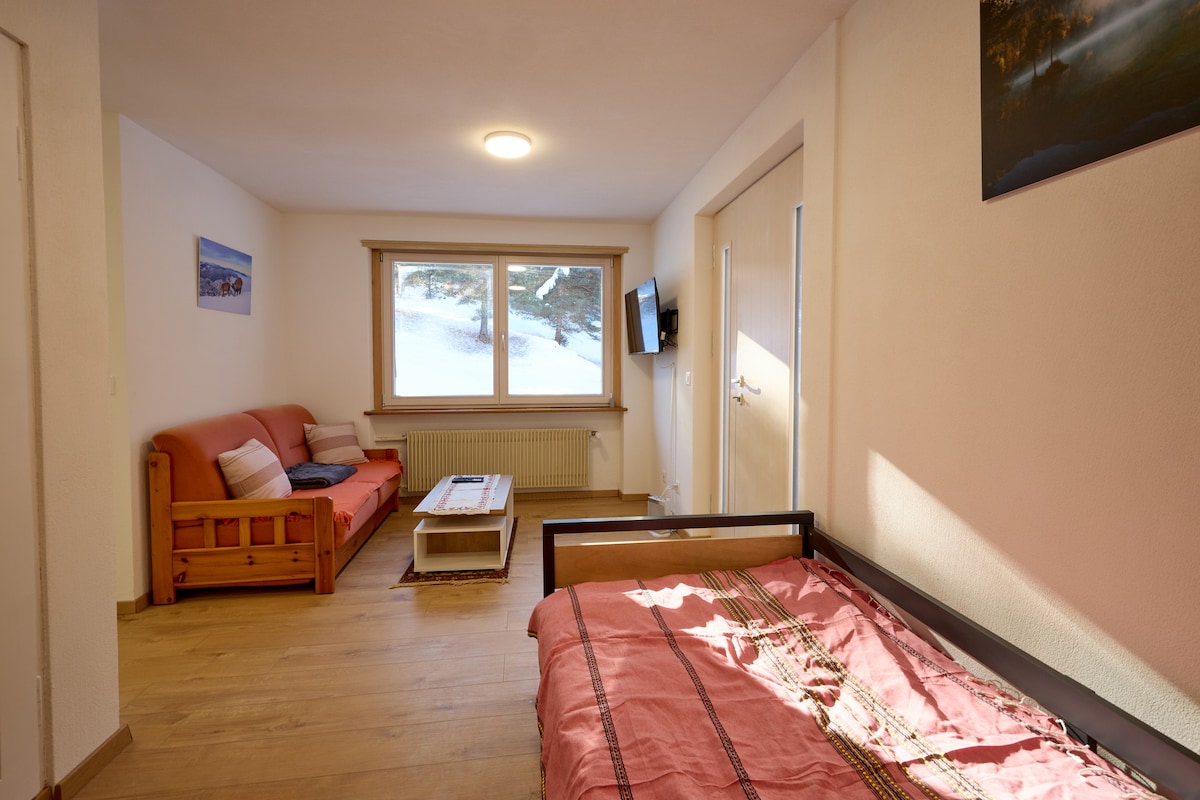Svetao i udoban stan sa 2,5 sobe za 1-5 gostiju, veliki južni balkon, 100 m do besplatnog ski autobusa, mašina za pranje veša, mašina za sušenje veša, kuhinja sa mikrotalasnom rernom, šporetom i šporetom, mašina za sudove, raclette roštilj, stereo sistem sa CD-om i radiom, kablovska televizija, brzi Wi-Fi/internet, sauna.