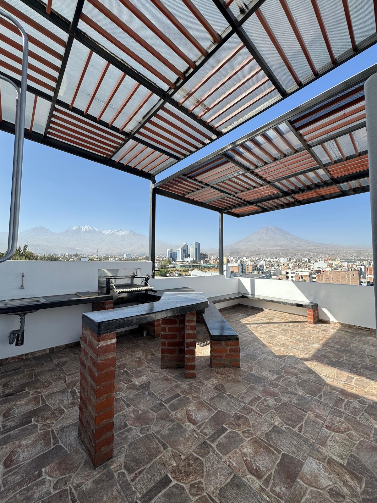 Uživajte u vrhunskom apartmanu na 4. spratu moderne zgrade, sa najsavremenijom glavnom bravom, koji se nalazi u mirnom naselju u Arekipi. Nudi 2 udobne i ušuškan spavaće sobe sa privatnim kupatilom, američkom kuhinjom-trpezarijom i velikim zajedničkim prostorom za roštilj na gornjem spratu Wi-Fi i TV usluge sa striming kanalima i filmovima Kućni ljubimci, žurke i okupljanja nijesu dozvoljeni Maksimalno 4 osobe