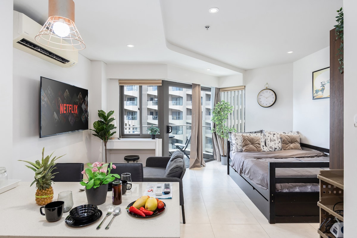 Relax in this stylish studio at Tambuli Residences with resort access. The studio is located on the 10th floor and offers ocean views. ★ SLEEPING & LIVING ★ ✔ Queen-size bed with high-quality bedding, sheets, and pillows ✔ 1 sofa bed with cushions (can be converted into an additional single bed) ✔ 55" Smart TV with Netflix ✔ Bluetooth speaker/radio ✔ Nightstands with reading light ✔ Fast Wi-Fi ✔ Balcony