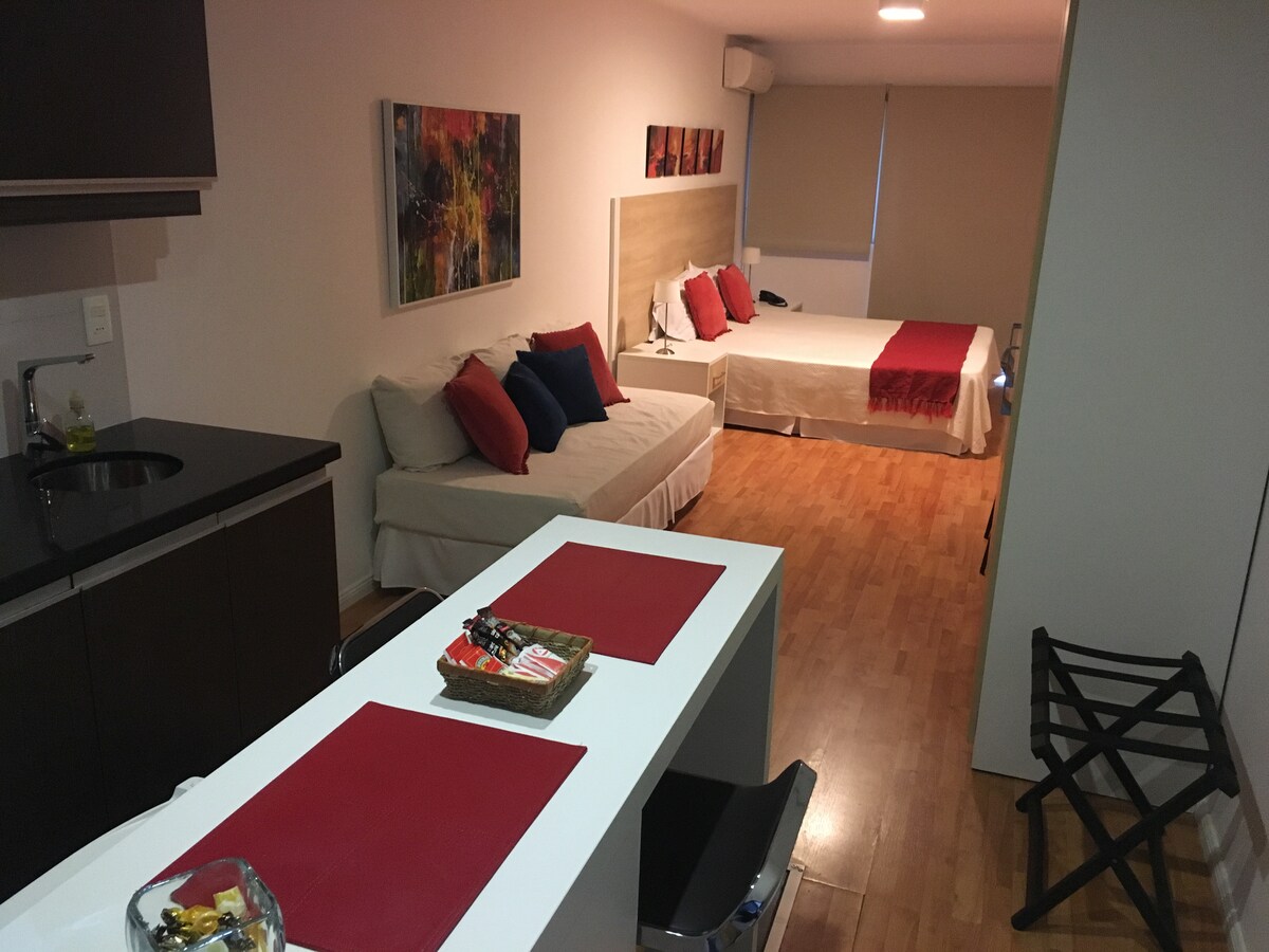 Uživajte u šarmu Montevidea u ovom potpuno novom modernom stanu, savršenom za putnike koji putuju sami, parove ili poslovna putovanja. Nalazi se u srcu grada, blizu svega i sa prelijepim urbanim pogledom, savremenim dizajnom i svim sadržajima. Stan ima danonoćno obezbjeđenje, a njegova lokacija se nalazi na jednoj od glavnih avenija u gradu. Idealno mjesto, udobno i funkcionalno , za nezaboravan boravak u Montevideu.