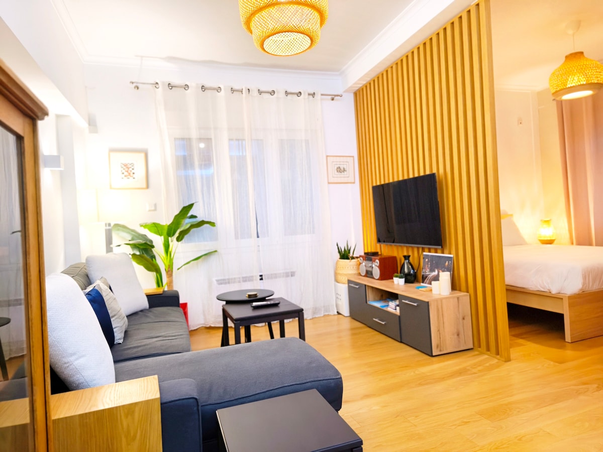 Elegantan stan inspirisan Bauhausom na 1. spratu istorijske zgrade stare 100 godina. Renoviran 2023. godine i na korak od brda Likabet (manje od 1 minuta hoda). Moj smještaj je savršen za parove koji žele da pronađu mir i opuste se u stambenom komšiluku i žele da istraže Atinu. Opremljen Starlink internetom (brzina od 300+Mbps). Samo 10 minuta od Kolonakija i Pagkratija i lagane šetnje do Exarchia i trga Sintagma. Dišite i opustite se u ovom mirnom i elegantnom prostoru.