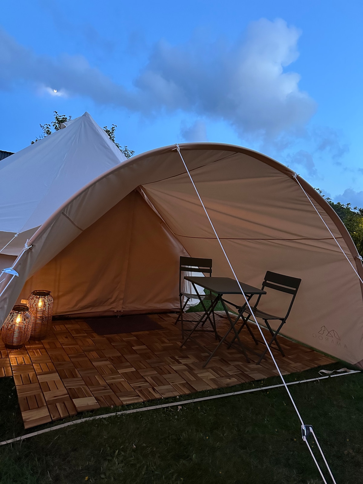 Volite kampovanje, ali biste voleli da spavate malo luksuznije? Onda isprobajte naš divni veliki glamping šator Starglaze, prečnika 6 m. To je jedini šator na terenu. Šator je opremljen bračnim krevetom i za 4 osobe, namijenjen je za 2 odrasle osobe i 2 djece. Biće dostupna dva dušeka koji se mogu rasklopiti. Kuvanje će se odvijati na otvorenom, a na raspolaganju su kamin i roštilj na ugalj. Kada stignete, kreveti su namješteni, a peškiri su takođe obezbijeđeni.