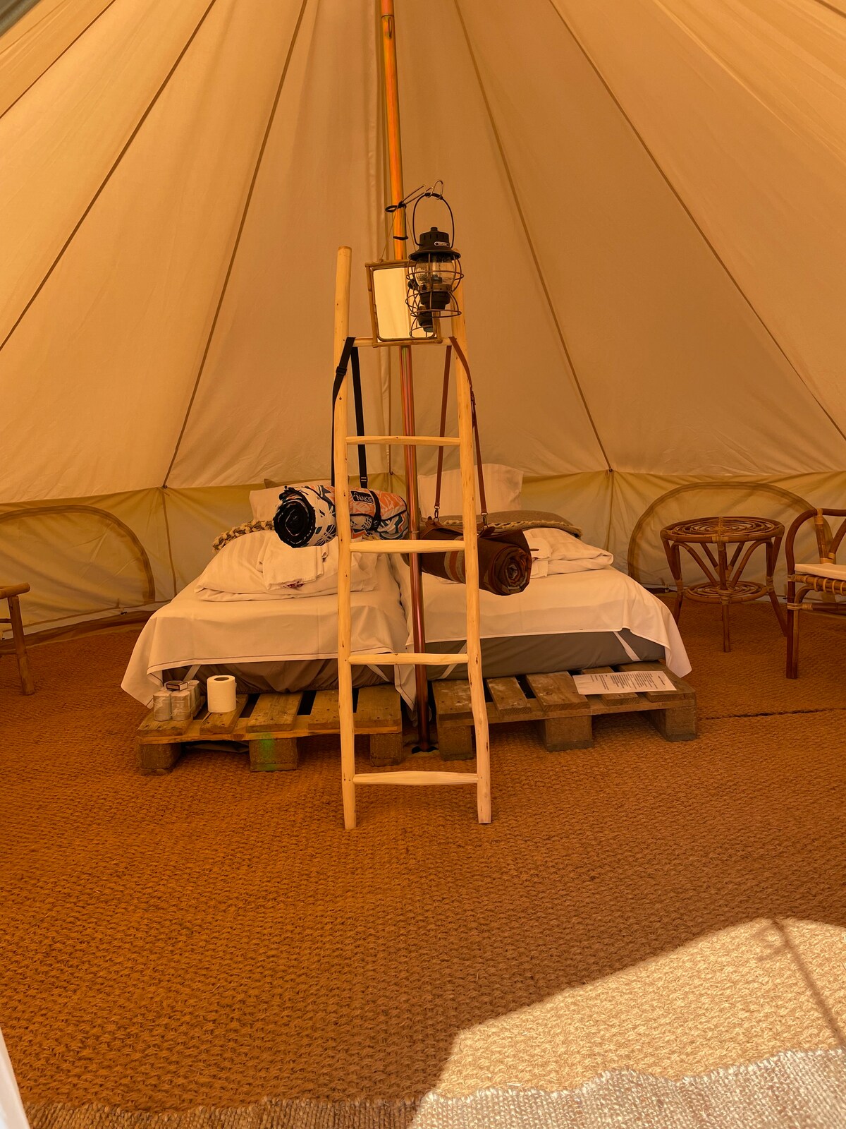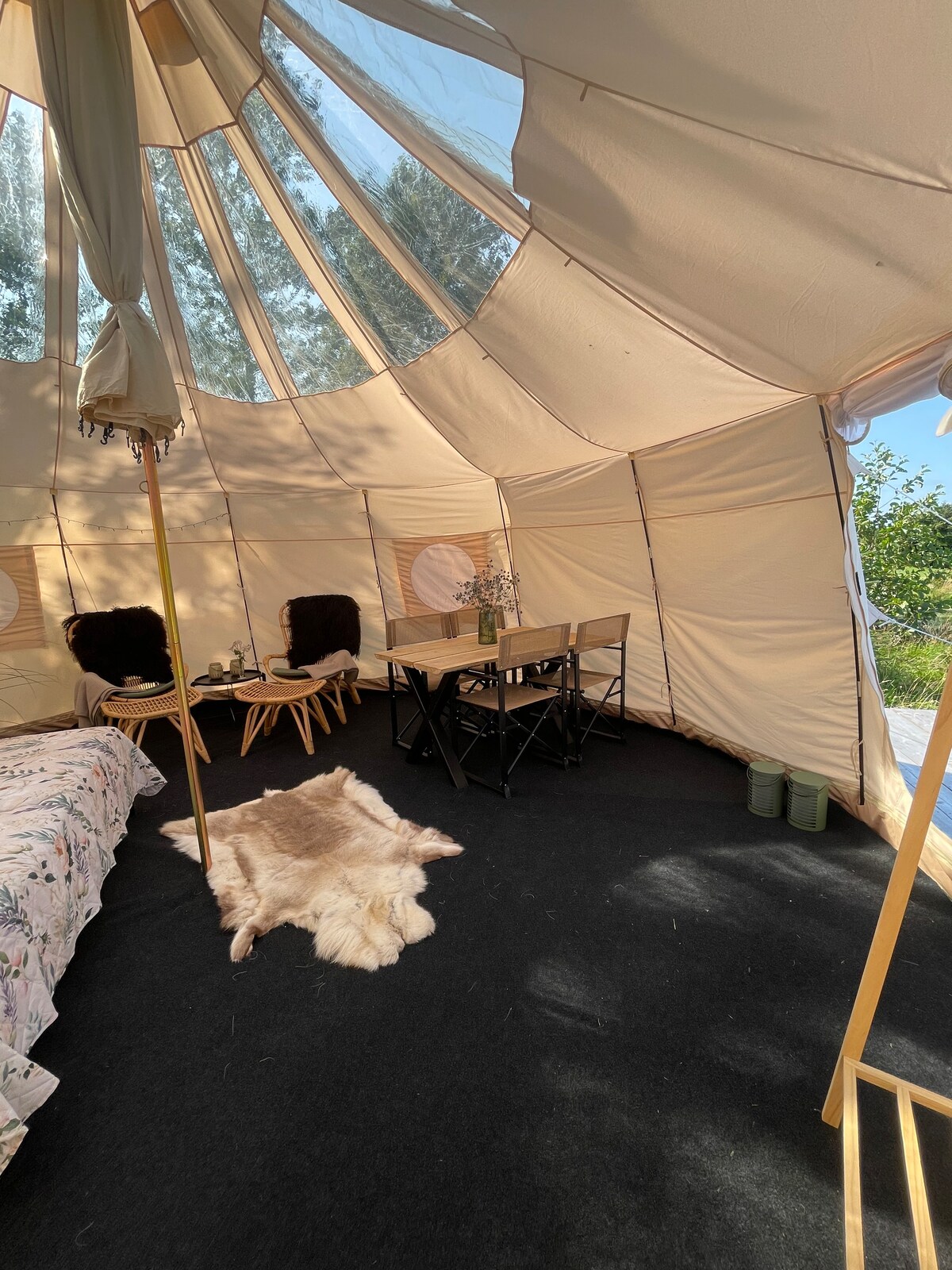 Luksus glamping telt med bund. Træterrasse udenfor med havemøbler. I teltet er der 1 dobbeltseng med dyner og puder. Mulighed for 2 ekstra pladser på foldemadrasser. Toilet findes ca. 60 m fra teltet i det røde hus. Der findes også en udebruser med lidt varmt vand (10 L og derefter er der kun koldt vand). Man kan lave mad på bålstedet eller i udekøkkenet. Du kommer til at bo inde i en lille skov i en meget naturskønt område, hvor der er et rigt dyreliv.