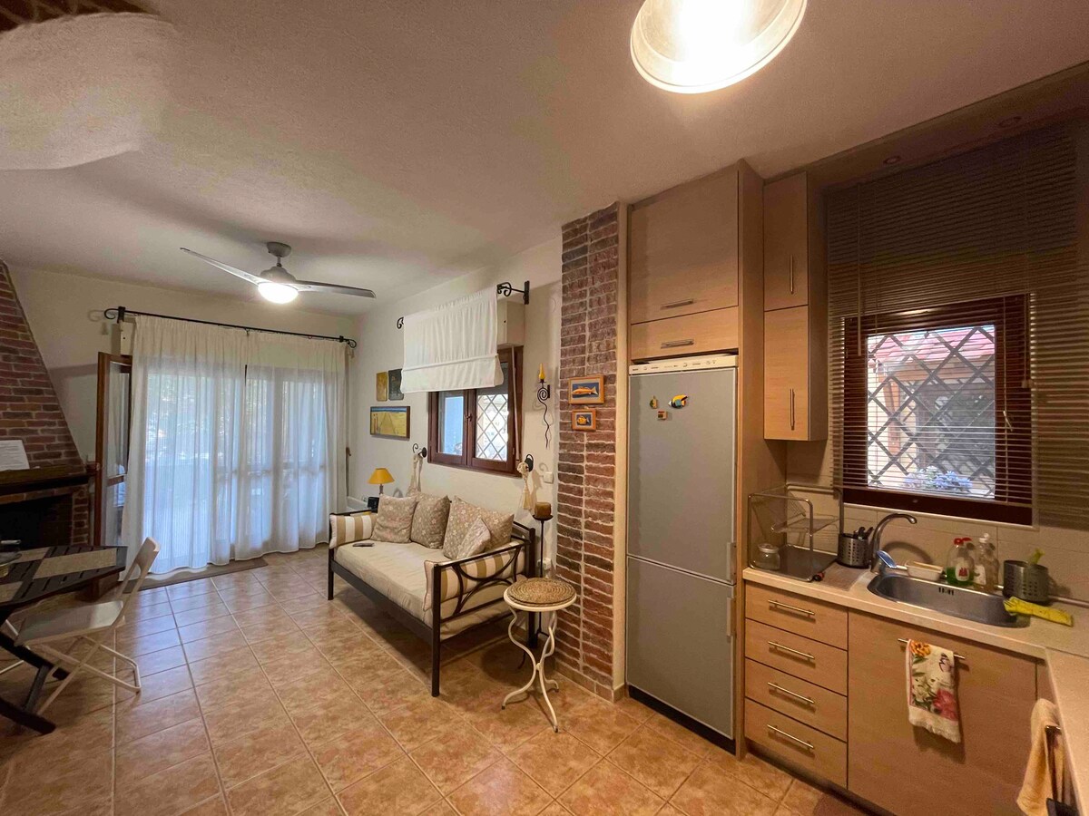 Moderna boho kuća za odmor udaljena samo 50 m od mora, u mirnom kompleksu pored mora u Latouri, Halkidiki. Potpuno renoviran mezonet sa 2 spavaće sobe (bračni kreveti), dnevnim boravkom, opremljenom kuhinjom i modernim kupatilom. Ispred kuće se nalazi veliki trpezarijski sto u zajedničkom vanjskom prostoru, savršen za obroke i opuštanje. Plaža je udaljena 4 minuta hoda, a voda je mirna i kristalno čista. Privatni parking • Wi-Fi • Klima-uređaj Idealno za parove i porodice.
