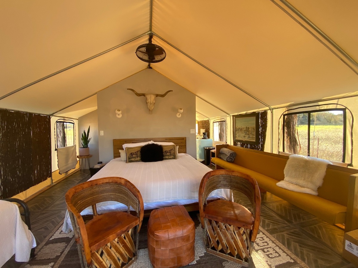 Glampovanje pod zvijezdama * Strogi bez kućnih ljubimaca Ovi zidni šatori od platna su dizajnirani da vam ponude sve što vam je potrebno tokom boravka. Svaki šator je potpuno vodovodan, ima privatno kupatilo/tuš-kabinu, toplu vodu, čajnu kuhinju, klima-uređaj i TOPLOTNU jedinicu, kao i šporet na drva. U svakom šatoru imamo i kaubojske bazene. Postoje samo dva šatora sa zajedničkim ognjištem sa kaubojskim kotlom. Noćno nebo u Teksasu i mnoštvo zvijezda✨⛺️. Kreirano za avanturu i povezivanje. Poruka za šator u isto vrijeme!