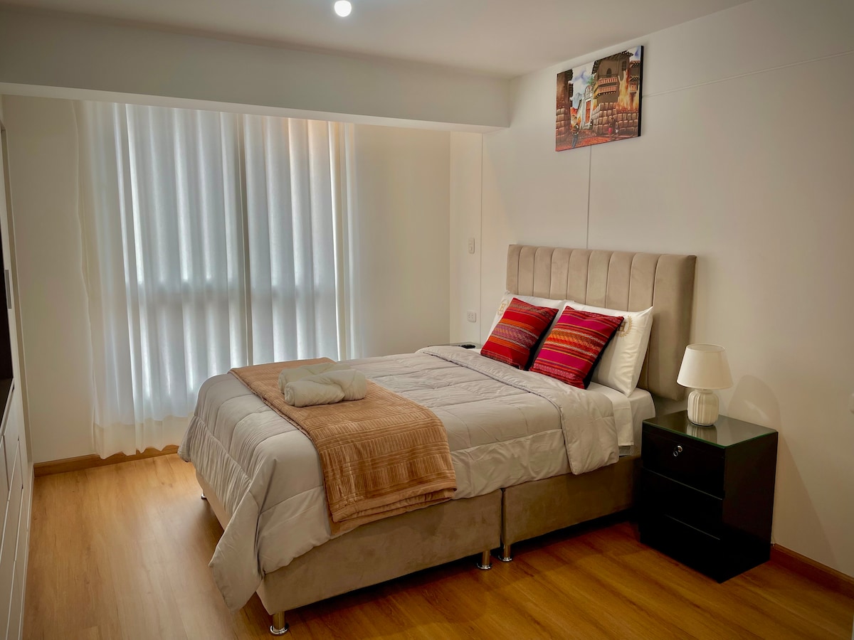 Uživajte u udobnom, tihom i veoma svijetlom boravku u ovom potpuno novom apartmanu, potpuno namještenom i opremljenom. Nalazi se u strateškom području Kuska: samo 10 minuta od trga Plaza de Armas, 7 minuta od aerodroma i 5 minuta od prizemnog terminala automobilom. U blizini ćete pronaći parkove, rekreativne centre, pijace, tržne centre, restorane, bolnice i klinike. Idealno za porodice, parove ili putnike koji traže udobnost, čistoću i odličnu lokaciju.