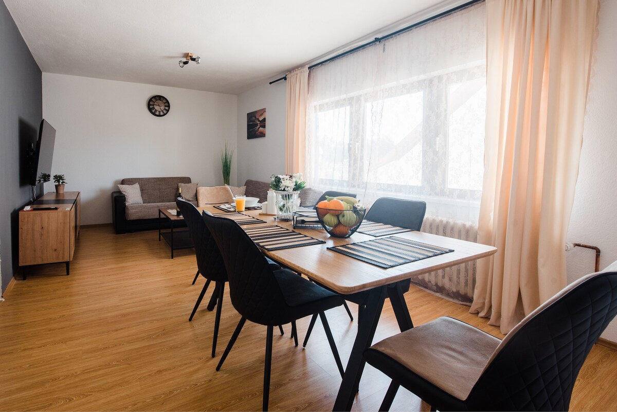 Vrhunski opremljen, sa svim neophodnim sadržajima za udoban boravak. Apartman nudi dnevnu sobu sa ugaonom kaučem na razvlačenje, potpuno opremljenom kuhinjom, balkonom, spavaću sobu sa velikim bračnim krevetom i potpuno opremljenim kupatilom. Stan ima optički internet i TV sa preko 3000 programa, filmova i serija. Kako bi se naši gosti osećali kao kod kuće, pobrinućemo se za potpunu udobnost i bezbjednost našeg boravka. Dobro došli svima i radujemo se vašem dolasku!