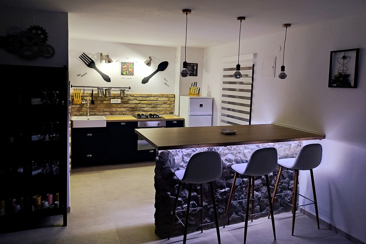 Ova drvena moderna kuća sa dva odvojena stana savršen je izbor za one koji putuju kao par i žele miran smještaj u kontaktu s prirodom. Kuća je udaljena 5 minuta vožnje od Nacionalnog parka Plitvička jezera. Kuća se sastoji od dva odvojena stana, svaki sa sopstvenim ulazom i zasebnom terasom. Stan ima prizemlje i spavaću sobu na spratu.