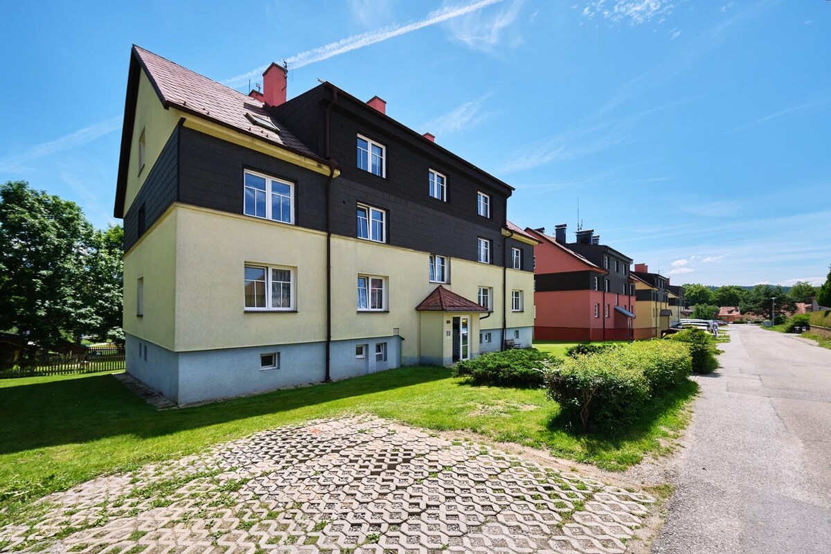 Stan 5 km od Česki Krumlova, dizajniran za nezahtjevnu klijentelu ,ima svoj ulaz, a moja majka živi u drugoj polovini kuće. Stan je idealno smješten kao polazna tačka za planinarenje , vožnju biciklom , plivanje u jezeru Lipno i skijanje zimi. Prednost je obližnja željeznička stanica za putovanja u Šumavu ili posjetu Český Krumlov. Životinje nisu dobrodošle - imamo psa.