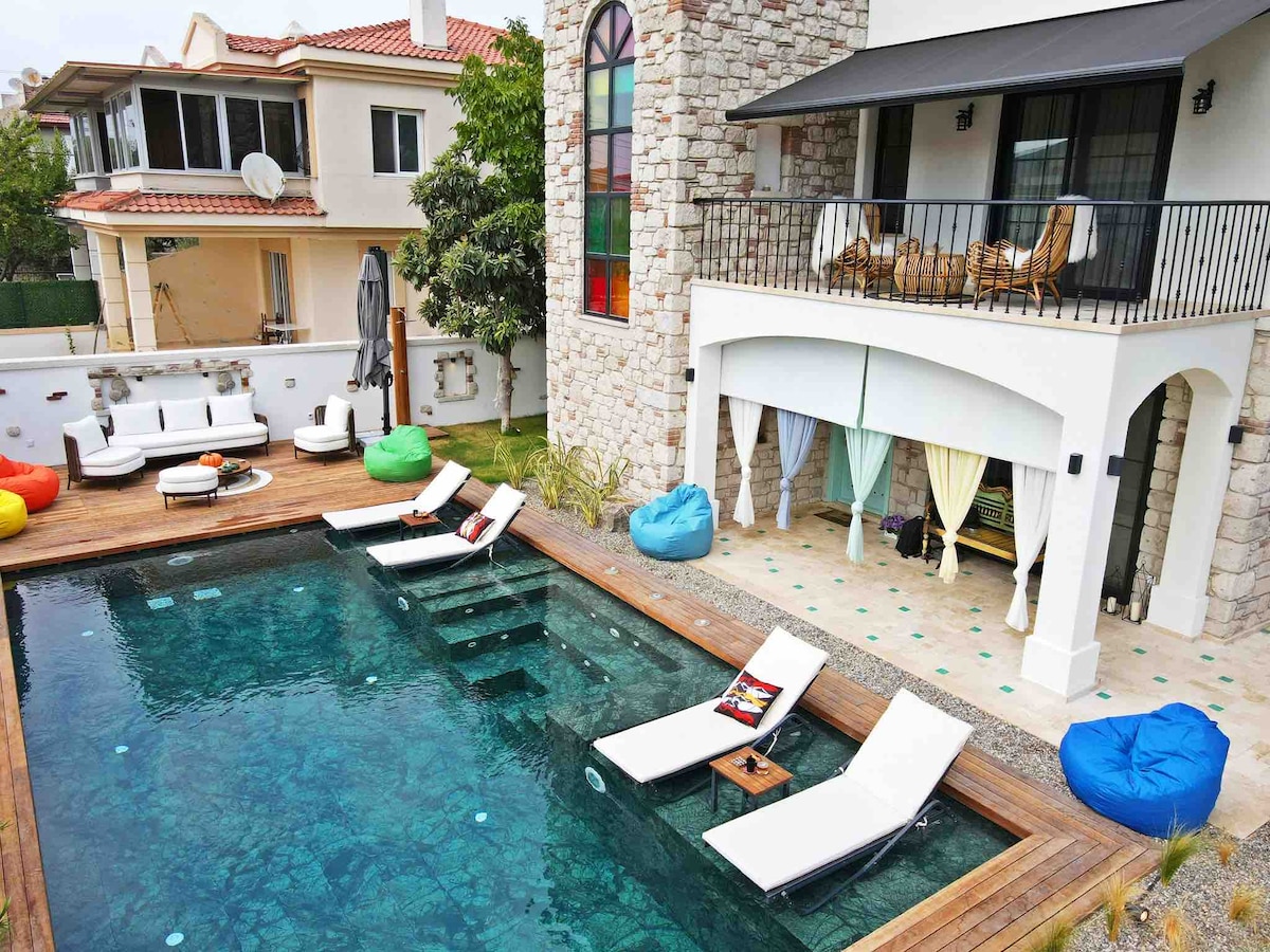 Uživajte u ljetu u našoj modernoj vili sa 4 spavaće sobe u Alaçatı – privatni bazen, sunčana bašta i potpuna udobnost vas čekaju! Svaka soba ima klima-uređaj, modernu kuhinju, mašinu za pranje veša i sredstva za čišćenje. Jednostavno kontrolišite sve pomoću sistema pametnog doma. Uživajte u pristupu internetu od 100 Mb i Netflix-u. Sav namještaj je potpuno nov i pažljivo odabran. Nalazi se u centru grada i ima jednostavan pristup plažama i restoranima.