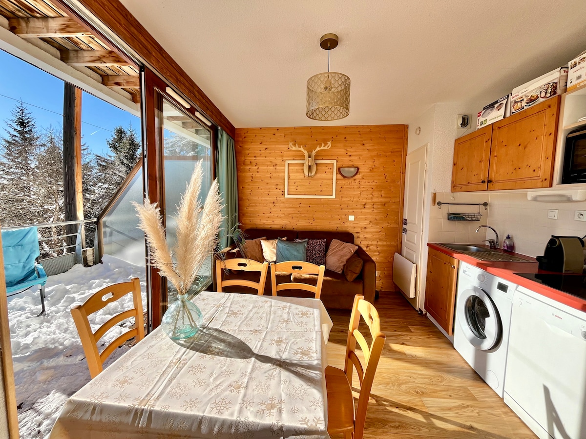 Prekrasan stan 4 kreveta, sa spavaćom sobom, balkon okrenut ka jugu, veoma svetao, sa pogledom na dolinu koji oduzima dah. Nedavno renoviran, funkcionalan, dobro opremljen, u blizini svih sadržaja (prodavnice, restorani, iznajmljivači skija, paketi) TV, višejezične društvene igre Skijaške i biciklističke staze u krugu od 2 minuta hoda (na raspolaganju je ormarić) Moguć je popust na opremu za skijanje Besplatan parking ispred objekta Dođite i uživajte u ovim prostorima kao par, prijatelji ili porodica!