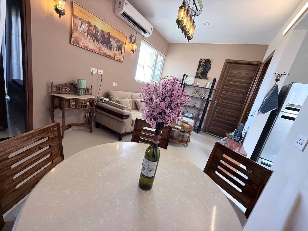 Otkrijte profinjenu udobnost u ovom svijetlom i prozračnom utočištu u Sektoru 70, Mohali, koje se nalazi na trećem spratu (pristup stepenicama) – savršeno mjesto za odmor za putnike koji putuju u Manali Šimla Kufri/Daramšalu Uživajte u privatnom Full HD projektoru za ugodne filmske večeri. Najbolja lokacija: • 25 minuta do aerodroma Čandigar, železničke stanice i autobuske stanice • 15 minuta do bolnica Fortis, Sohana i Ivy • 5 minuta do CP67 i Džubili Voka U blizini tržnog centra Elante, ružičnjaka, kamenog vrta i jezera Sukna. Mirno, bezbedno i dobro povezano.