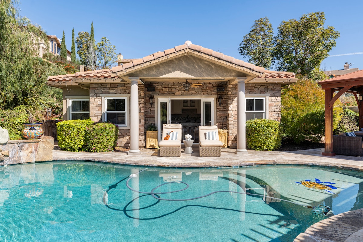 Moderni porodični bazen na farmi, kućica na drvetu, boćanje