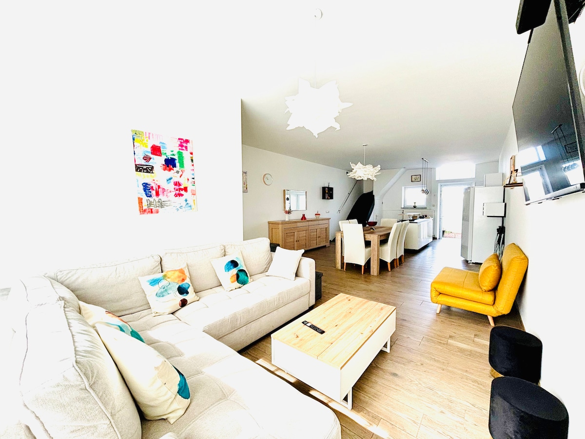 Parfait pour visiter Namur à pied, en famille ou entre amis. Grande maison calme mais proche du centre/ de la gare (avec 1 place de parking juste devant). Les espaces communs sont au 1er étage : vaste double séjour, cuisine équipée… Au rdc, vous trouverez baby-foot, ping-pong et borne d’arcade. Tout est prévu pour voyager léger (draps et serviettes fournis). Notre priorité : confort et convivialité. Welcome 😀