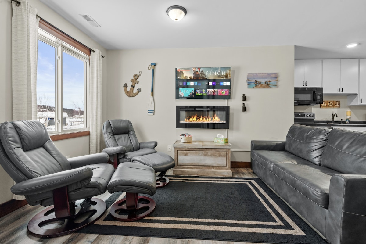 Lijep, čist stan na samo 5 minuta od Mičigen Techa i pogled na Portage Lake (pristup jezeru takođe!). Dostupna je jedna tezga parkinga u garaži, tako da možete da idete pravo od automobila do stana bez snijega. Prilaz je oran. Wi-Fi, grijanje, izbor kafe iz aparata Keurig su uključeni. Mašina za pranje i sušenje veša su u prostranom kupatilu sa tušem. Potpuno opremljena kuhinja i električni kamin. Lift za stepenice iz garaže. Bračni krevet sa dodatnim kaučem na razvlačenje (puno veličine) i dječjim krevetom.
