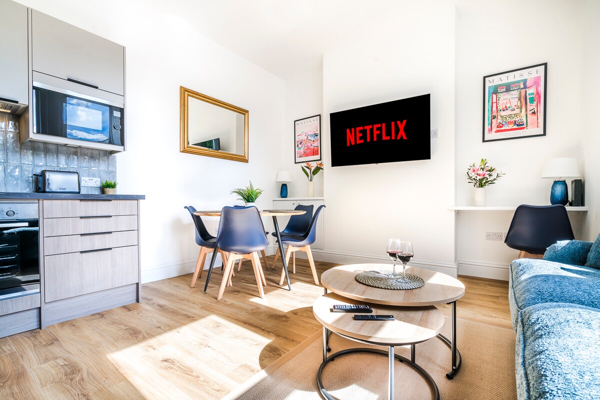 Ovaj cijeli stan u prizemlju u Cashalton Beeches sa parking mjestom ima mermernu kuhinju, luksuznu tuš-kabinu (bez kade), mašinu za pranje sudova, mašinu za pranje veša i zasebnu mašinu za sušenje veša i dobre TV kanale. To je bezbjedno, udobno i prijatno mjesto za provođenje vremena! Željeznička stanica je udaljena manje od 10 minuta hoda, a direktni londonski vozovi traju manje od 40 minuta. Spavaća soba ima bračni krevet i bračni kauč u dnevnom boravku. Privatno dvorište pozadi ima sto i stolice za opuštanje/objedovanje.
