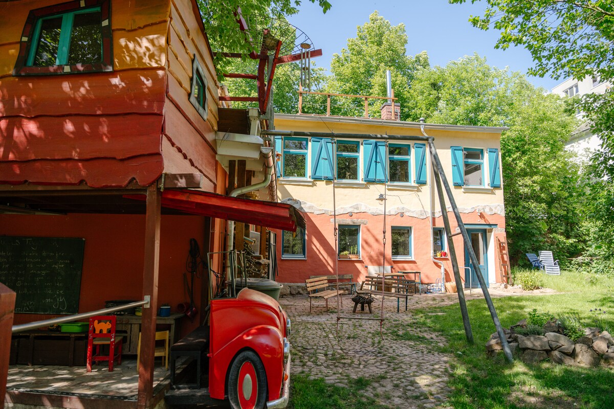Da li ste ikada bili na odmoru u moderno renoviranoj secesijskoj vili? Sa rustikalnim kaminom i idiličnom sobom u tornju? Sa saunom i teretanom? Iako je pijaca udaljena samo tri minuta hoda, možete se opustiti u zajedničkoj bašti od 2000 m² sa opremom za roštilj, terasom i prostorom za logorsku vatru. Novouređeno kupatilo nudi modernu udobnost. Dobro započnite dan mirisnom kafom i svježim organskim jajima iz našeg kokošinjca u Kräuterhaus Forchheim.