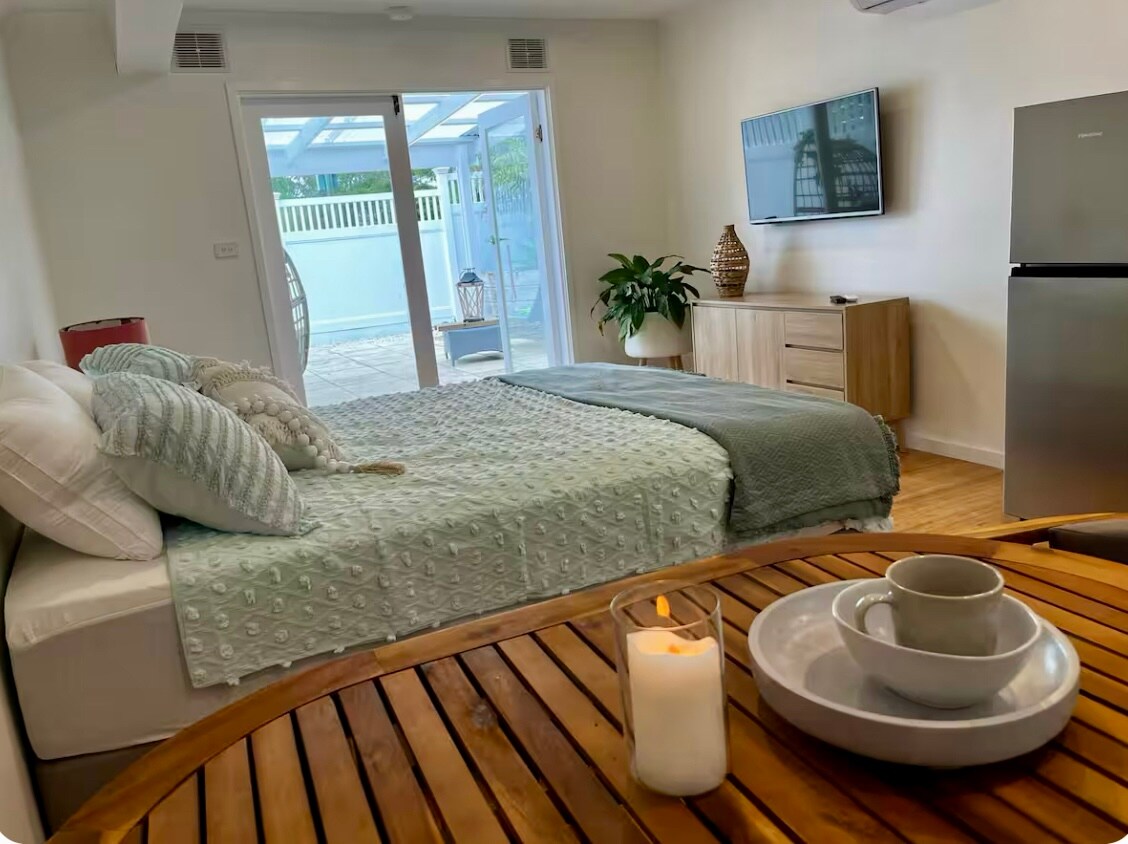 Zaista luksuzno utočište za parove! Ovaj privatni smještaj u stilu vile ima sopstveni privatni pristup i terasu u kojoj se možete opustiti i ima topli spoljni tuš. Opremljen je kvalitetnim namještajem i instalacijama i opremljen svime što vam je potrebno! Lokacija zaista ne može biti bolja od ove. Nalazite se preko puta prelijepe plaže Blue Lagoon Beach! Sa kafićem Bateau Bay Beach udaljenim 150 metara. Kuhinja ima frižider, zamrzivač, mašinu za sudove, mikrotalasnu rernu i električni tiganj. Napomena: nije ploča za kuvanje ili rerna.