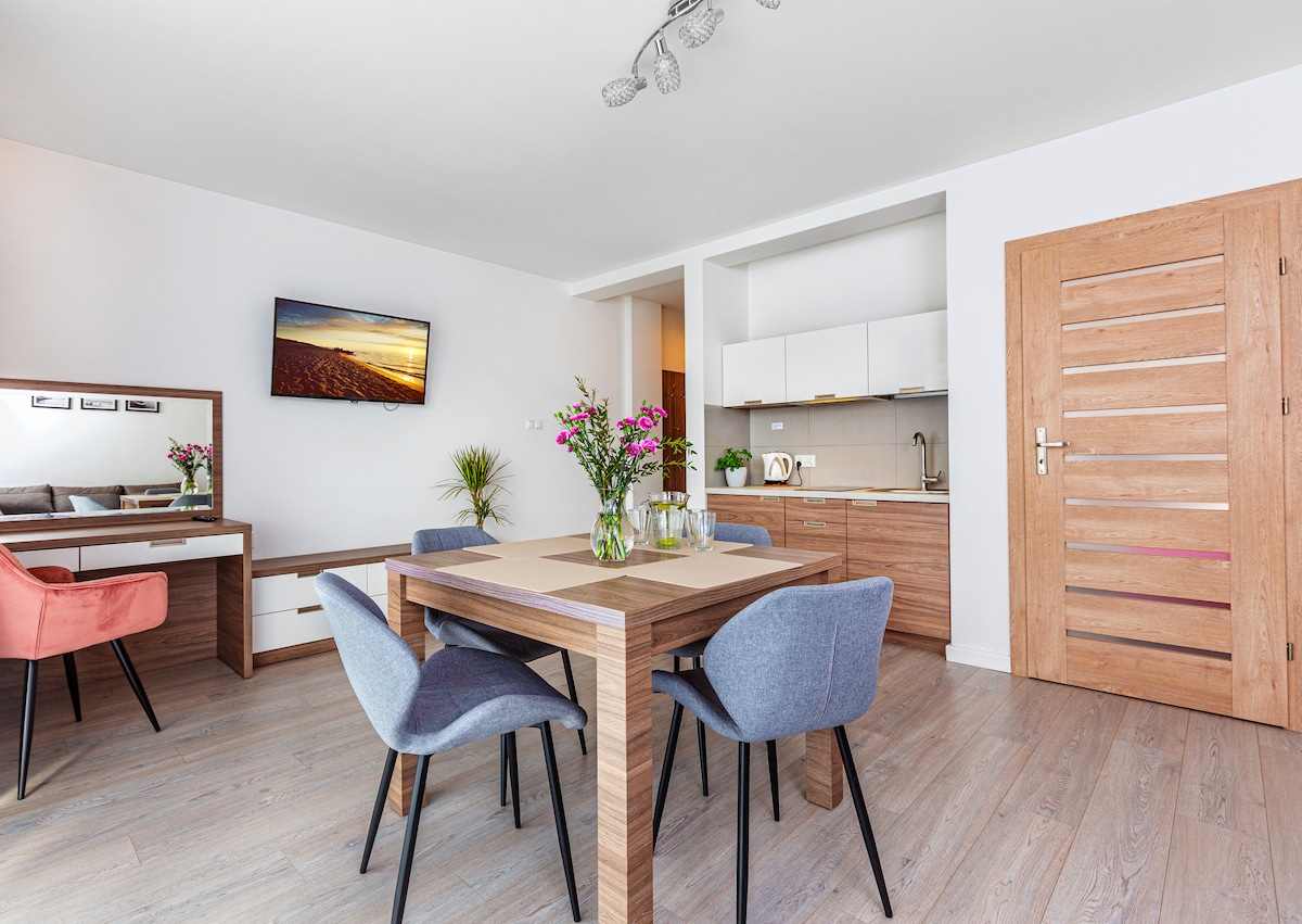 Stan (40 m2) udobno i moderno uređen koji se nalazi na 3. spratu stambene zgrade (sa liftovima i nadzorom) u okrugu Gdanjsk-Vžešč. Sastoji se od: dnevnog boravka sa čajnom kuhinjom, spavaće sobe sa udobnim krevetom 140/200, kupatila, balkona. Stan je potpuno opremljen i ima sve pogodnosti neophodne za stanare: kablovsku televiziju, Netfliks, brzi internet, mašinu za pranje sudova, rernu, frižider itd. Idealno za parove, maksimalan broj gostiju je 4 osobe.
