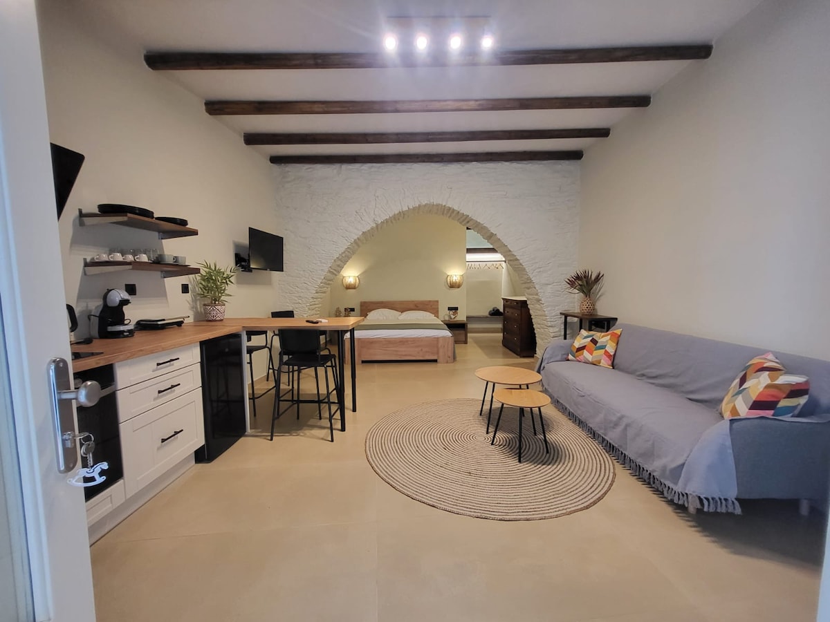 Dobro došli u naš svijetli i gostoljubivi studio, izgrađen s poštovanjem prema tradicionalnoj kikladskoj arhitekturi. Bijeli zidovi, moderni detalji i prirodni materijali stvaraju spokojnu i autentičnu atmosferu. The studio ia located in the center of town,(may have a noise in the night) Garsonjera uključuje: • Udoban bračni krevet • Potpuno opremljena čajna kuhinja za pripremu doručka ili laganih obroka • Ukusno kupatilo sa tuš-kabinom u tradicionalnom stilu • Klima-uređaj, TV i Wi-Fi