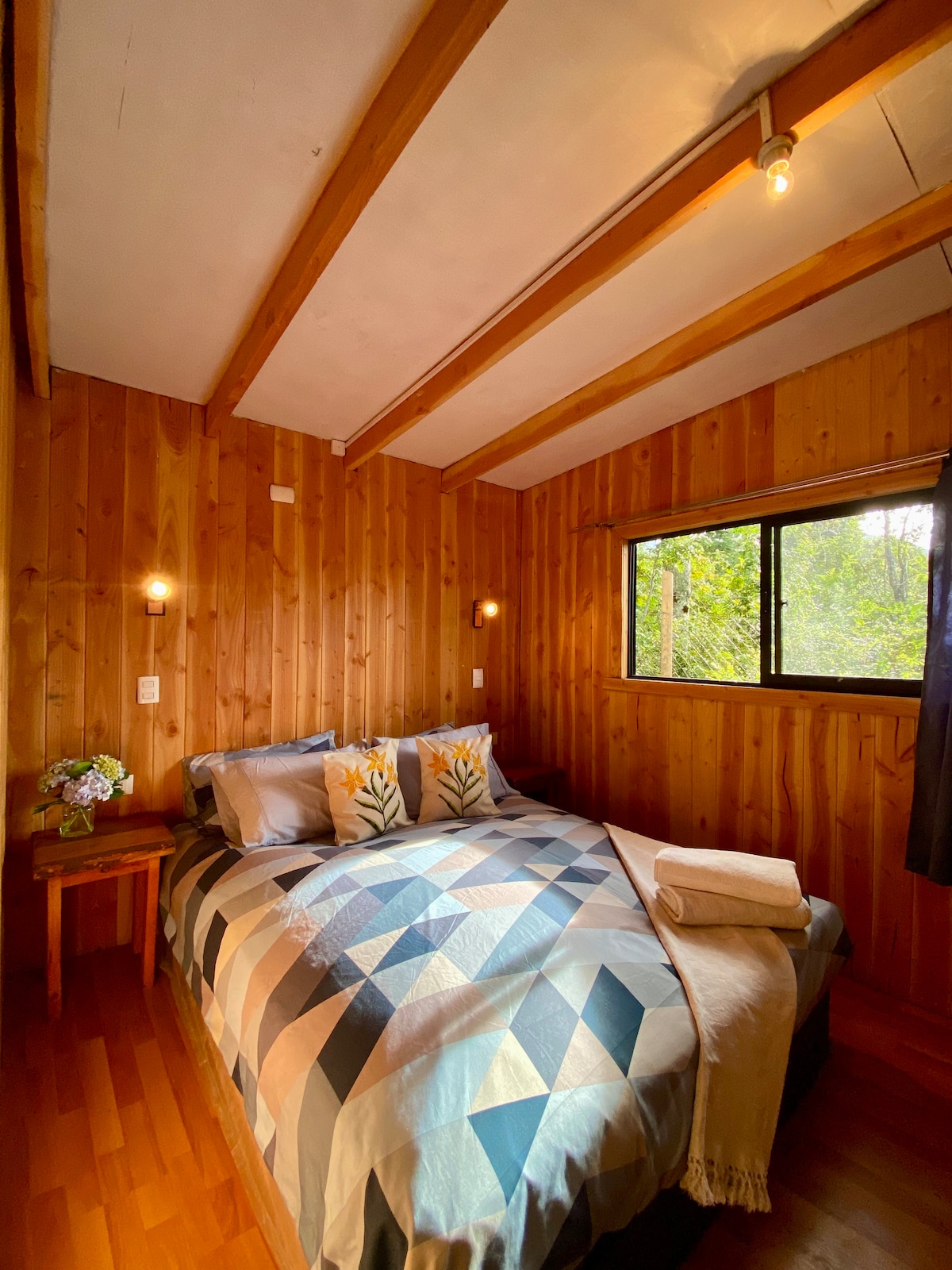 A solo 10 minutos de Huilo Huilo y otros atractivos turísticos. Cabaña para 4 personas full equipado y con conexión a y wifi El comedor cuenta con microondas, licuadora, vajilla completa, utensilios y TV con wifi. Además, quincho y áreas comunes, compartidas con los demás huéspedes. Piscina techada (no temperada) Tinaja y sauna privados a orilla del estero (servicio adicional, reserva con 1 día de anticipación). Incluye sábanas y toallas. Estadía mínima: 2 noches La calefacción es con bosca