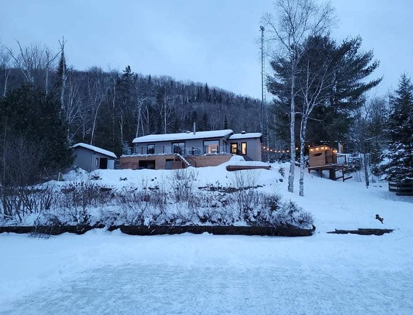 Naša planinska kuća u nordijskoj šumi savršena je za kvalitetno provođenje vremena kao par (ili s djetetom) ili za rad (sa brzim Wi-Fi mrežom). Drvena unutrašnjost je topla i prijatna. Kroz prozore pune visine pruža se zadivljujući pogled na šumovitu dolinu. Kuhinja otvorenog koncepta i dnevna soba vas održavaju u razgovoru dok kuvate. Ako više volite da kuvate napolju, tu je ognjište sa roštiljem i trpezarijskim stolom na otvorenom. Samo 70 minuta vožnje od Montreala. Jezero je udaljeno 25 minuta hoda ako parkirate u blizini.
