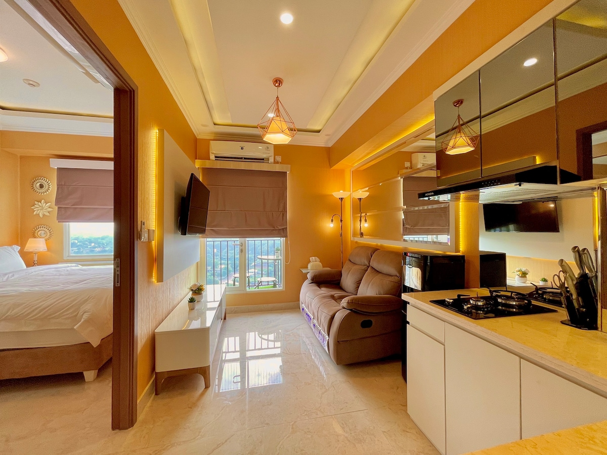 Modern Studio with Amenities & Mall Access in Depok Experience comfort and convenience in this cozy studio apartment, perfect for business or leisure. Equipped with essentials like a TV, high-speed WiFi, refrigerator, and water dispenser, it also boasts a scenic view for a relaxing stay. You can also enjoy the apartment's swimming pool. Note: albeit we DON'T provide water heater for shower, the water temperature here is generally comfortable 😊