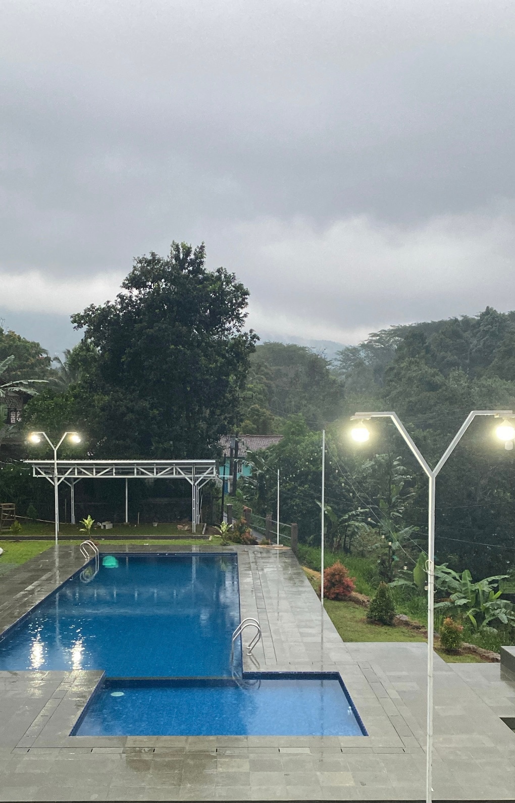 Vila Kami – Cijeruk, Bogor Privatna vila s pogledom na Gn Salak i Gn Gede Pangrango. Strateška lokacija, čak i neparna, u blizini hitova i restorana. Dostupne su 3 spavaće sobe (2 dolje, 1 mezanin), 2 kupatila, potpuno opremljena kuhinja, dnevna soba i trpezarija. Sadržaji: bazen, bilijar, roštilj, karaoke, pametni TV + Netflix, Wi-Fi, klima-uređaj, bojler, tradicionalne igre, balkon, 2 pomoćna kreveta. Udoban kapacitet za 10 osoba. Savršeno za porodice i zabavan odmor kod kuće!