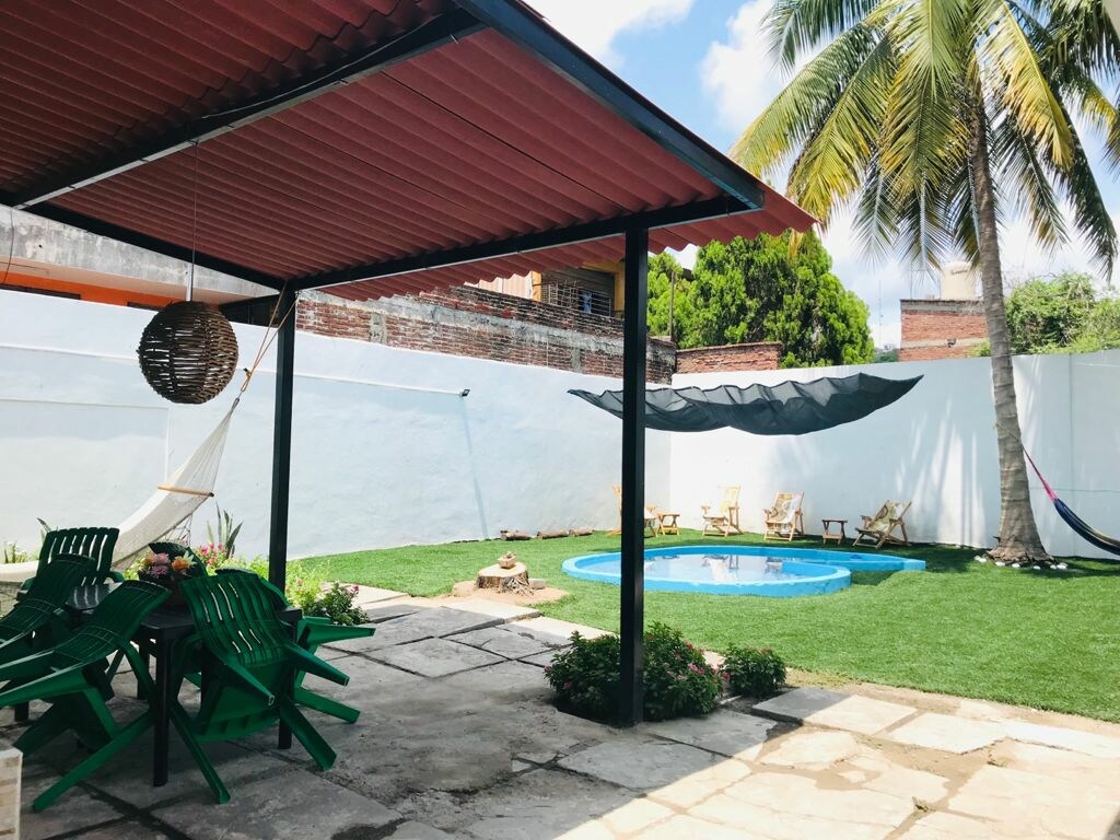 Opustite se sa cijelom porodicom u ovom smještaju u kojem je mir prozračan, samo 8 kilometara od plaže El Real, 2 minuta od Plaza Alameda i 4 minuta od centra Tekomana. Ima 2 spavaće sobe sa bračnim krevetima, djelimično natkriveni i zatvoreni parking za 1 kolica, kupatilo, dnevni boravak, trpezariju i kuhinju. potpuno grijani, solarni grijač, internet i TV od 50". dvorište sa djelimično natkrivenim prostorom za pranje veša.