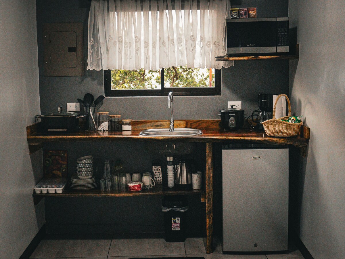 Relájate en este espacio tan tranquilo y seguro cerca del volcán 🌋 arenal , la cuidad esta a 6 minutos donde encontrarás de todo farmacias , Walmart , hospital, etc Dentro de la habitación hay menú de restaurante (Kenko)que te brindan servicio express gratis a la puerta 🚪 Estás en los árboles 🌳 el baño amplio conexión de Alexa , cama King , cocina de gas 💨 La habitación se llama Cedro por la madera de su interior