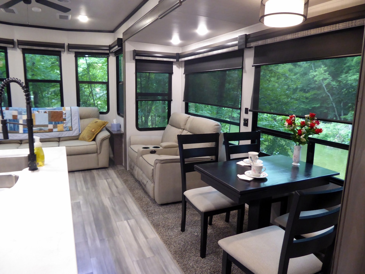 Opustite se i zabavite na prelijepom jezeru Moss i razmazite se u svom potpuno novom luksuznom kamperu. Prostrani životni prostor je ispunjen svjetlom i ima sve moderne pogodnosti. Velika terasa s pogledom na vodu je ograđena i ograđena, što je čini bezbjednom za malu djecu. Nalazi se u privatnoj uvali u potpuno šumovitom području, veoma je tiho. Možete uživati u glampovanju, šetnjama stazama u prirodi, plutati na vodi, plivati, pecati, voziti kajak ili se voziti pedalinom. Dopašće vam se ovaj nevjerovatni objekat uz jezero!