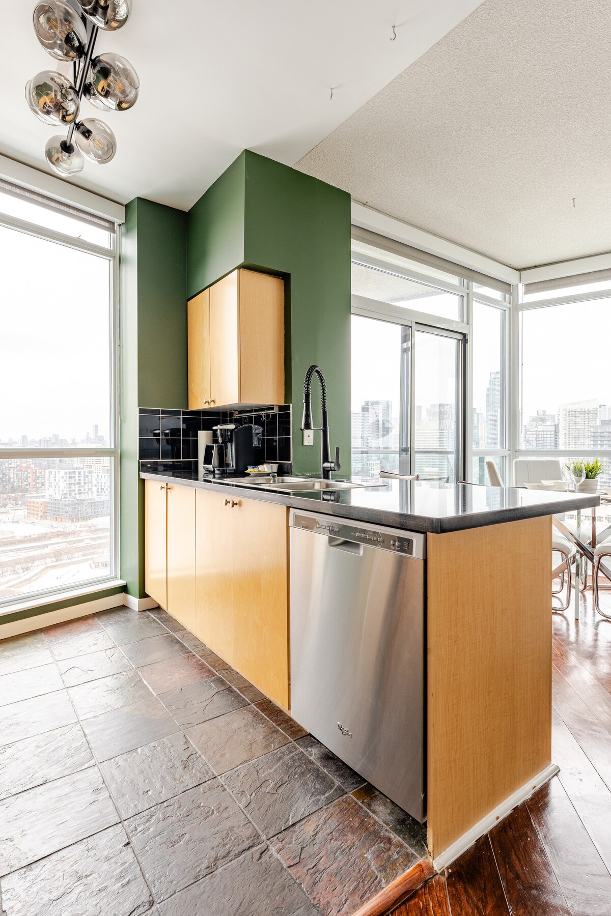 Ovaj jedinstveni penthaus u centru Toronta ima plafone visoke 6 metara i opremljen je dizajnerskim namještajem i umjetničkim djelima. Ovdje nijesu dozvoljene zabave ni glasna okupljanja. Biće otkazani. Dozvoljeno je samo 4 osobe do ukupne jedinice, a nadzire ih konsijerž koji radi non-stop, prijaviće svakog gosta i dozvoliti samo 4 osobe. 3 spavaće sobe jedna na spratu samo krevet 1 bračni krevet i jedan bračni krevet na spratu. Na kauču može da spava i 1 osoba, ali to nije krevet. Ognjište i prava luksuzna umjetnost sa TV-om od 75inča