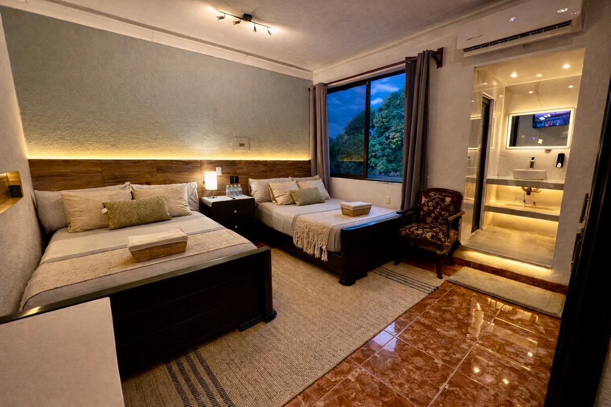 A pasos del centro y opción de acceso autónomo, 1 recámara deal para 2 o.3 personas con cama king e individual. A partir de 4 huéspedes, se accede a la 2da. estancia con cama matrimonial para 2 más, espacio de trabajo y terraza; así el alojamiento es perfecto hasta para 5. Ambas tienen baño privado, tv, clima y wifi. En área común: mesita comedor para 2, barra para 2, salita, frigo, micro, cafetera, utensilios, licuadora y área para lavar trastes. Ambiente 100% familiar, no se permiten fiestas.