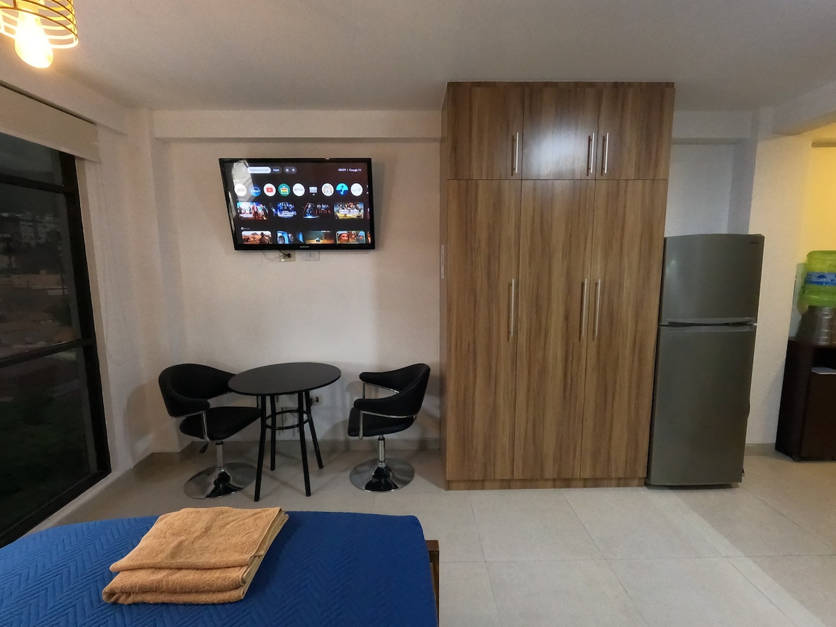Opustite se u ovom mirnom i elegantnom prostoru. Ekskluzivan prostor u zgradi, idealan za vas ako putujete sami ili u pratnji posla, posla ili odmora. Stan ima lift, parking, Wi-Fi, Netflix. Namješten je i opremljen svime što je potrebno za prijatan boravak od 2 osobe. Nalazi se osam minuta od centra Cochabamba ili Quillacollo. Prostor nije pogodan za kuvanje ili pušenje. Za boravke duže od 5 dana čišćenje se vrši uz doplatu.