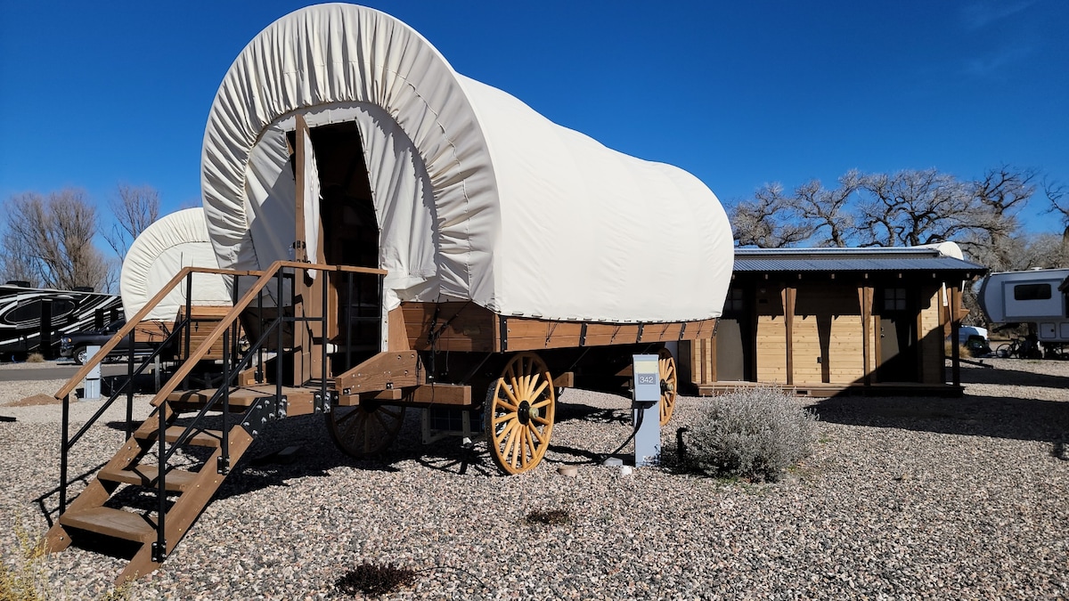 Doživite glampovanje u najboljem izdanju u divljem, divljem zapadu! Svaka kolica s drvenim okvirom na platnu mogu da prime do četiri gosta s bračnim krevetom i krevetom na sprat. Sadržaji uključuju grijanje, klima-uređaj, Wi-Fi, mali frižider, utičnice za elektronske uređaje i aparat za kafu marke Keurig. Gosti uživaju u privatnom grijanom kupatilu sa zatvorenom tuš-kabinom koja se nalazi odmah iza vagona. Dvije Adirondack stolice ispred svakog vagona pružaju prijatno mjesto za opuštanje pod nebom Arizone.