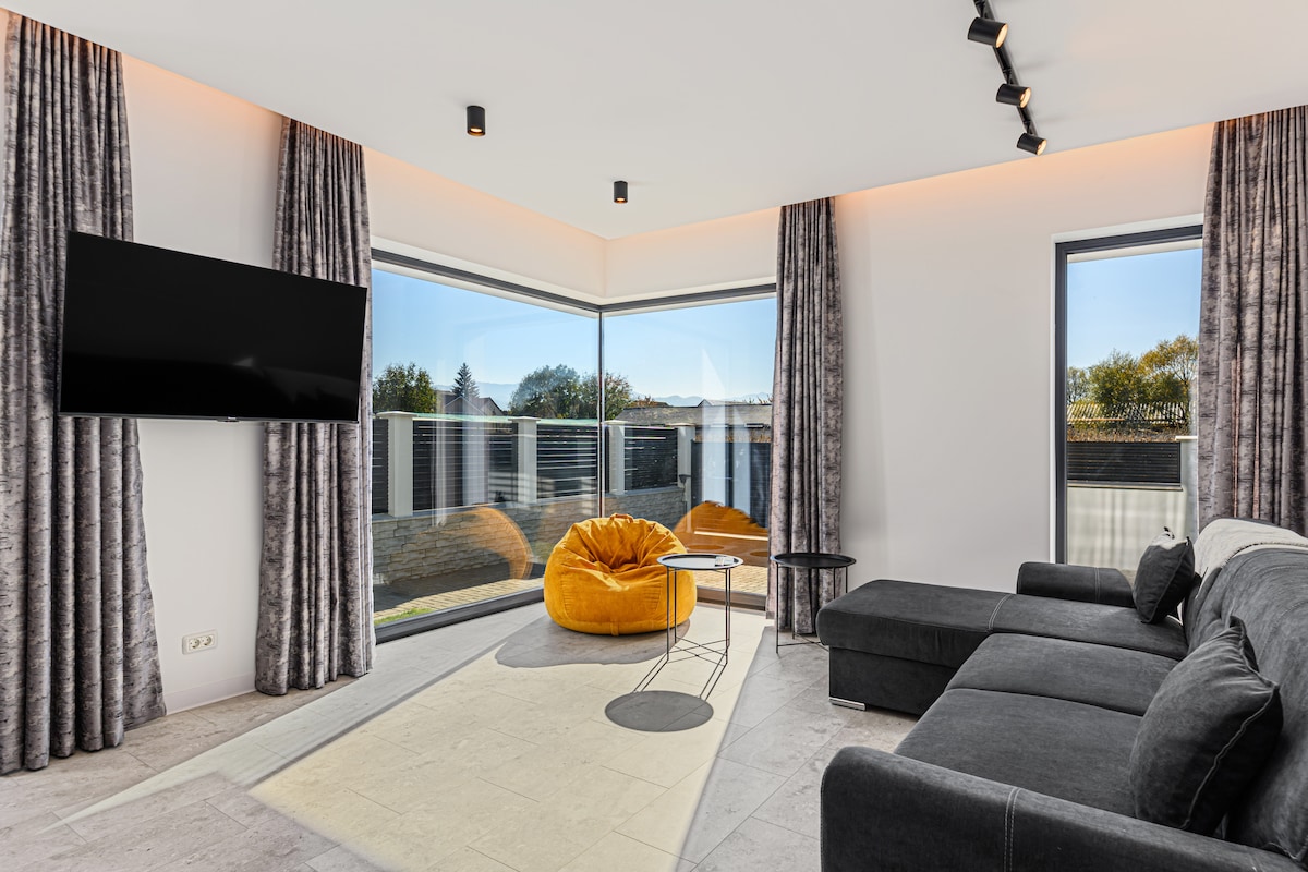 A uniquely and carefully designed, this apartment perfectly combines coziness with stunning Scandinavian accents. Situated in a new residential neighborhood, we go above and beyond to ensure a unique experience for our guests. Our home can accommodate up to 4 people and has its parking lot. The standout feature of this penthouse is the spacious terrace with a jacuzzi and a panoramic view over the mountains, being ideal for couples, business travelers, solo adventurers, or families (with kids).