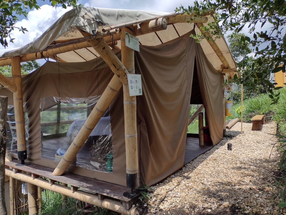 Disfruta de un espacio en una granja, lleno de naturaleza con una experiencia de hospedaje en camping pero bajo nuestra estructura en guadua, mayor percepción de los sonidos nocturnos de la naturaleza pero alejado de los peligros y la interperie, en plataformas protegidas de la lluvia y de las inclemencias del clima, con elementos de comodidad qué hacen su estadía placentera.