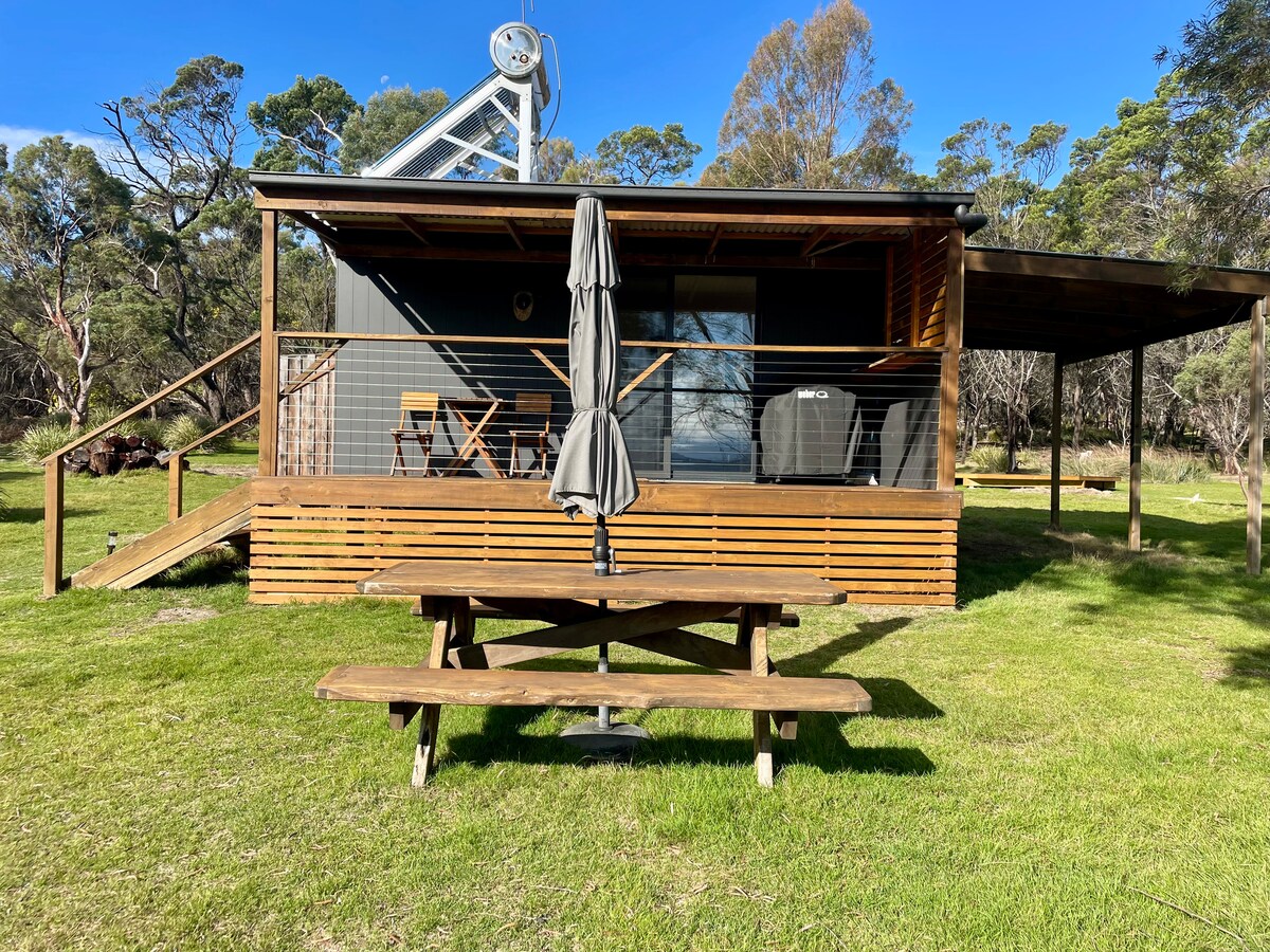Relax in a peaceful bush setting & connect with nature. This small off grid cabin is situated on a 100 acre property located on Freycinet Peninsula, close to Friendly Beaches, Moulting Lagoon & Freycinet National Park. The space is clean, cosy & comfortable with queen bed, kitchenette & bathroom. Perfect for one or a couple. Unwind from the days adventure with the gentle sounds of nature, local bird life & ocean swell.. Watch the eagles return home as the sun sets and the stars come out.