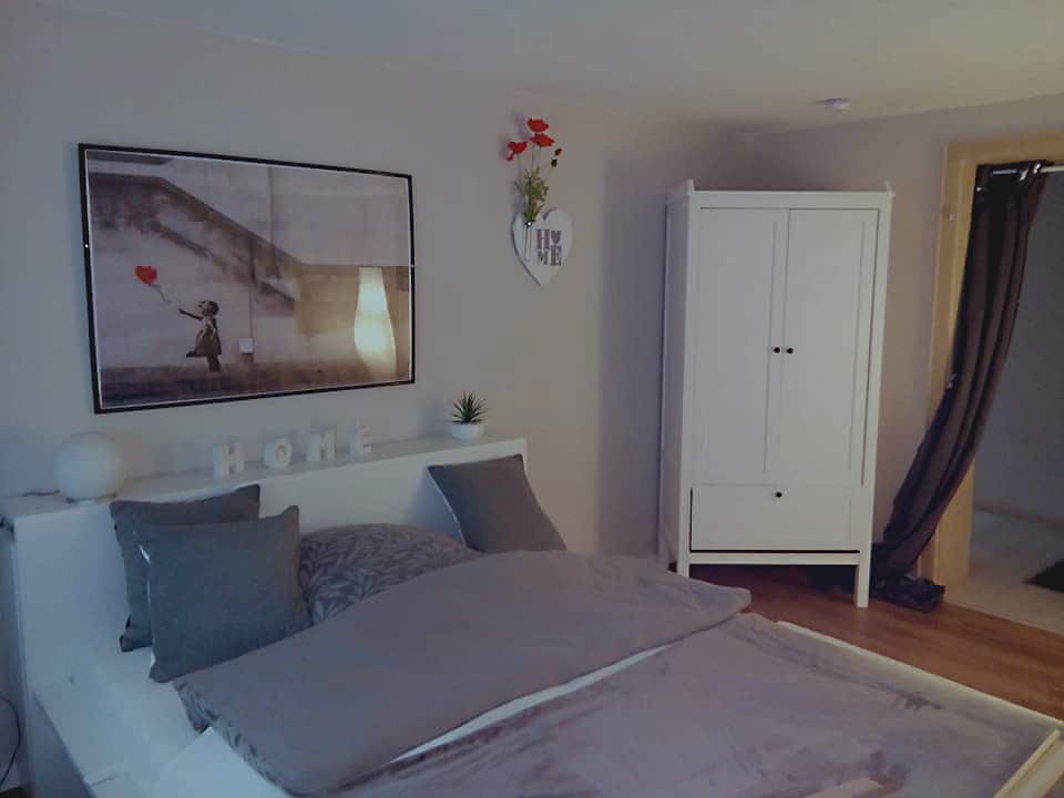 Vrlo miran, prelep stan, 26m2, na poslednjem spratu kuće sa 2 porodice. Pogodno za 2 osobe, krevet za goste na naduvavanje za 3. osobu. Otvorena kuhinja, aparat za kafu. Dnevni boravak sa dizajnerskom prekrivačem „White Limed Hrast“, krevet 140x200 cm. DVD plejer + ravan ekran, satelitska veza. Tuš 100x80 cm, toalet, umivaonik i ormarić sa ogledalom. Vrlo mirna lokacija na periferiji Hildena, lako dostupna, 5 minuta do autoputa A3 / A46, autobuske linije do Dizeldorfa, Mettman, Solingen