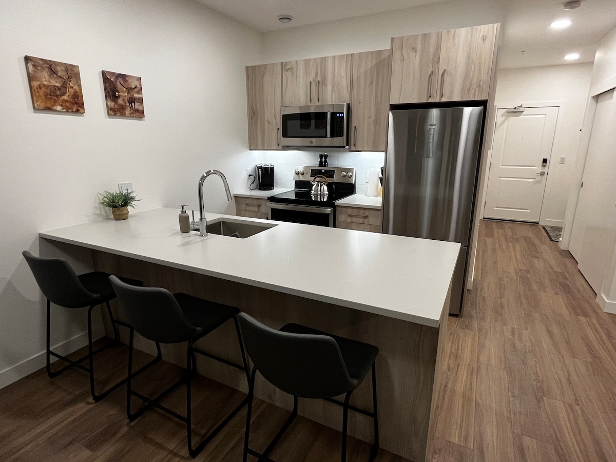 Ovaj udoban kondominijum se savršeno nalazi na pola puta između odmarališta Revelstoke Mountain Resort i centra grada. Cilj nam je da stvorimo boravak koji vam pruža doživljaj sam po sebi, a ne samo udoban krevet. Stan je pažljivo uređen sa toliko delova lokalnih slikara, fotografa i lončara koji su iz Revelstok-a i Britanske Kolumbije! Vaš boravak će vam sigurno ostaviti priču koju možete da ispričate pored istog starog dubokog praha sa strukom ili ogromnih skokova sa prljavštinom.