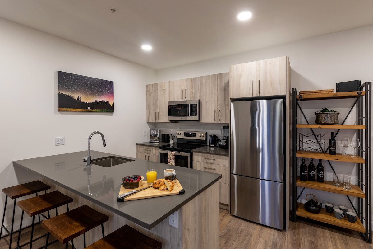 Oso Samit nudi luksuzne moderne smještaje dizajnirane za udobnost parova i putujućih profesionalaca. Smješten na gornjem spratu, uz obalu ovog nagrađivanog objekta, OSO Summit nudi beskrajne, netaknute poglede na planine, Kicking Horse Resort i rijeku Kicking Horse. Uživajte u cjelodnevnom suncu i posmatrajte zalazak sunca sa svog privatnog balkona uz rijeku. Zaputite se u Ethos Cafe i Whitetooth Brewing. Samo vas nekoliko koraka dijeli od svega što nudi Golden u centru grada.