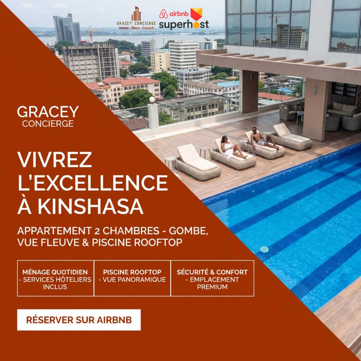 Ekskluzivni dizajnerski stan od 145m² na 9. spratu sa 2 lifta sa kojih se pruža panoramski pogled na rijeku Kongo, horizont Kinšase i finansijsku četvrt grada. Smješten u srcu Gombea, ovaj luksuzni prostor ima vrhunsku završnu obradu, sadržaje u stilu odmarališta, bazen na krovu, teretanu, danonoćno obezbjeđenje, privatni parking i kompletan rezervni generator — savršen spoj udobnosti, elegancije i praktičnosti.